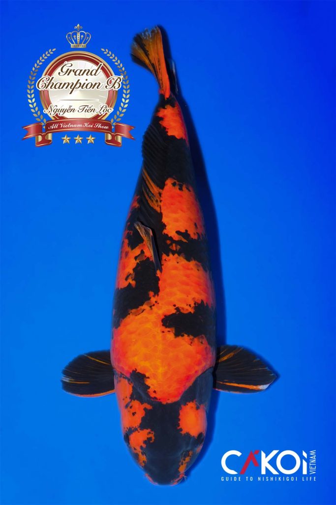 Tiếp theo là Hi-utsuri đoạt giải Grand Champion B thuộc về anh Nguyễn Tiến Lộc, anh chia sẽ: “Koi này được BGK chấm điểm gần như tuyệt đối với phiếu bầu 10/11. Về tổng thể thân hình cân đối kèm các mảng Sumi lớn rõ ràng phân bố đều từ phần lưng đến đuôi, Beni dày và rất sạch không bị lấm tấm khiến cho hoa văn đẹp và sặc sỡ, nó được mua trực tiếp tại Marudo Koi Farm lúc đó vào tháng 11/2022 đạt 75cm – 3 tuổi. Sau 1,5 năm chăm sóc đã đạt 83cm. Màu sắc cũng như thân hình đã thay đổi và đẹp hơn rất nhiều so với lúc mới mua ở Nhật, khi mang cá đến dự thi trên tinh thần là chia sẻ những chú cá Koi đẹp ra cho mọi người cùng chiêm ngưỡng, nhưng kết quả đã vượt ngoài sự mong đợi. Đây quả là thành quả của biết bao nhiêu Koikichi muốn có được.”