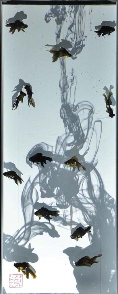 Bể cá độc đáo dung hòa giữa hình ảnh chuyển động của Cá vàng và hình tượng nghệ thuật vẽ mực, ý tưởng xuất phát từ tranh giấy treo tường “Wabi-sabi” mà chủ đạo là hội họa đơn sắc.