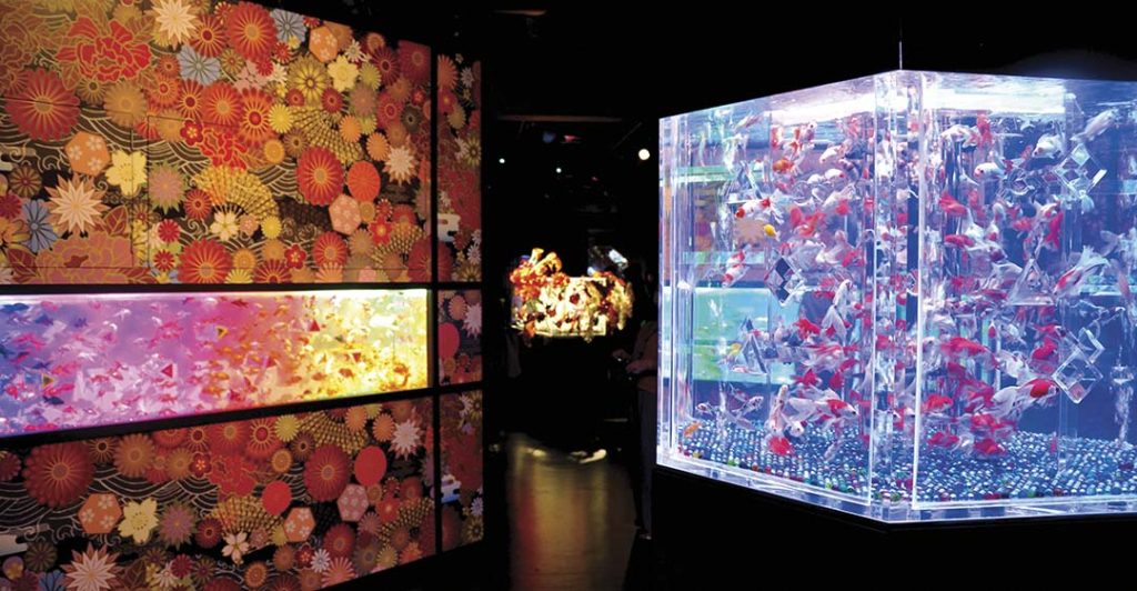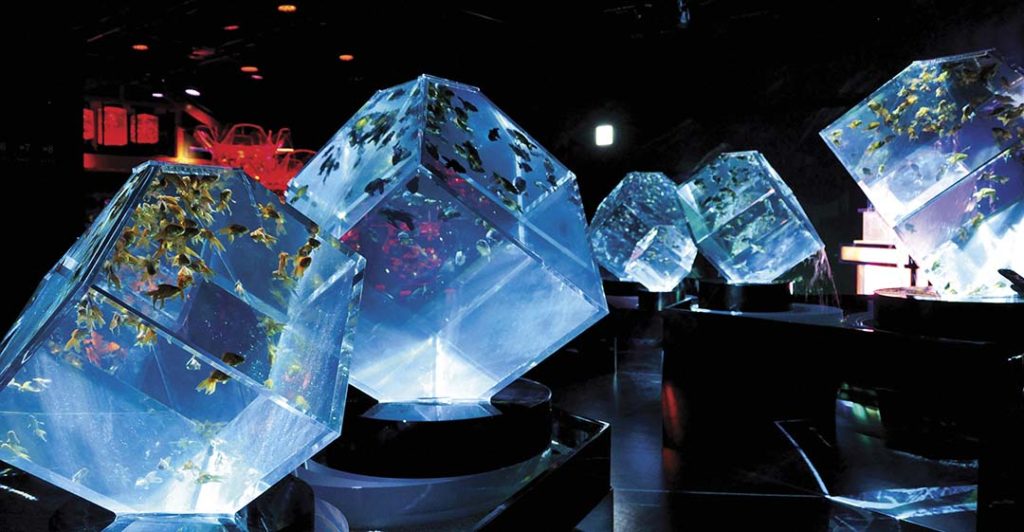 Bể cá treo tường chủ yếu trưng bày những con Cá vàng có tính nghệ thuật hiếm thấy.