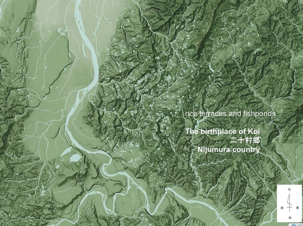 Nguồn gốc của Nishikigoi hiện nay được phân ra là Nagaoka và Ojiya, nhưng vùng đất này đã từng là một và trải dài từ thành phố Nagaoka đến thành phố Ojiya, được gọi là Nijyumurago. Cụ thể là khu vực làng Yamakoshi thành phố Nagaoka đến phía Đông thành phố Ojiya.