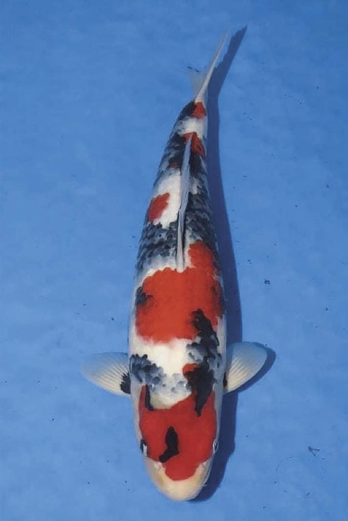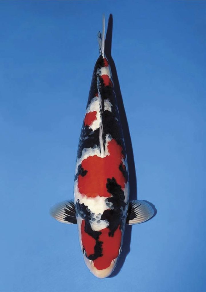 Sau đây, hãy xem những bức ảnh của Showa Sanshoku mượn từ những nơi phân phối (Hình 12, 13). Bên phải là một con 47 cm chụp vào mùa Thu năm ngoái. Một năm sau, đây là hình bên trái. Nó đã phát triển khoảng 10 cm, nhưng không chỉ vậy, nó đã trở thành một con Koi hoàn toàn khác. Đó là cái gọi là “biến hình”. Một năm trước Sumi (những vết đốm màu đen trên cơ thể của cá Koi) còn mờ. Nhưng giờ lại có cảm giác như cái gì đó nổi lên từ phía dưới, Sumi đã cố định giống cảm giác thực sự được gắn chặt. Hoa văn đỏ một năm trước còn nhợt nhạt nay đã chuyển sang màu đỏ, Kiwa mờ đã trở nên rõ ràng.