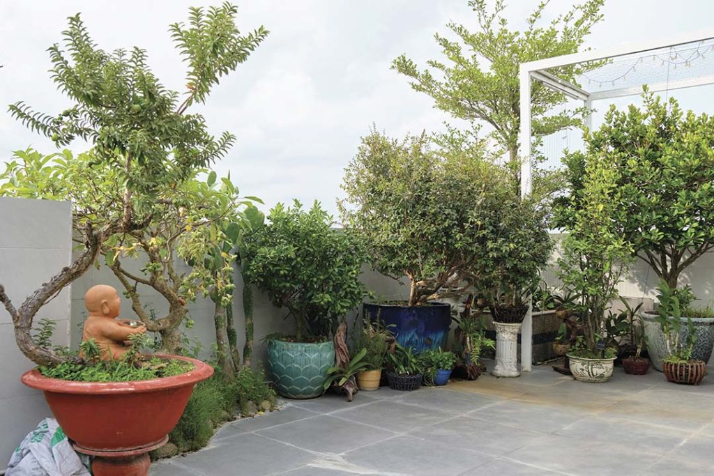 Được anh Phong chia sẻ, chúng tôi mới biết mỗi góc vườn đều là sự sắp xếp đầy dụng ý. Ban công hướng Tây lại ở tầng cao nhất nên thừa nắng thừa gió. Ở những góc đón nhiều nắng, anh trồng cây cao to để tạo bóng mát và cố định chúng bằng bồn. Tuy nhiên số lượng cây như vậy nên vừa phải, đặc biệt khi cây phát triển cao hơn lan can một chút thì phải cắt ngọn để cây không cao nữa, ở nơi nhiều gió như ban công thì cây cao quá sẽ dễ gãy đổ gây nguy hiểm. Không gian trống còn lại thì có thể trang trí những chậu cây hoa vừa, nhỏ để dễ dàng di chuyển, thay đổi thiết kế theo mùa (mưa, nắng) giúp mắt không bị nhàm chán. Vườn nhà anh hiện tại có vô số cây ăn trái, nào là khế, ổi, nho thân gỗ, sung, mận, tắc, cherry, còn hoa thì không đếm xuể. Nghe thì cảm thấy rậm rạp, nhưng nhờ được xếp khéo nên sân thượng trông vẫn rộng thênh thang.