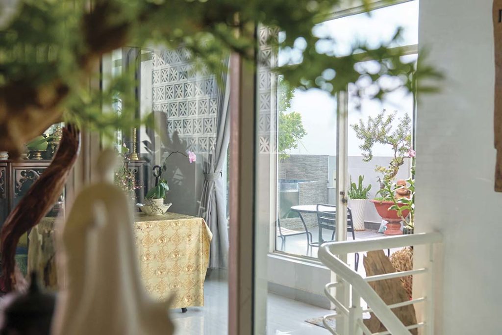 Nhà anh Phong là căn hộ trên tầng cao nhất của một tòa nhà phía Tây Nam Tp.HCM, có sân thượng hướng về phía Tây. Giữa sân là gian phòng thờ ốp kính dẫn xuống nhà chính, từ đây có một cầu thang xoắn dẫn đến nơi cao nhất của căn hộ, cũng như nơi cao nhất của cả tòa nhà, là không gian được gọi là “đài quan sát” như ở trên. Lấy gian giữa là phòng thờ làm trung tâm thì bên trái là vườn cây hoa và hồ cá Koi, còn bên phải là gian trà thất phong cách Việt cổ. Đi trên con đường từ hồ cá vòng sang trà thất, chúng tôi cảm thấy như đang du hành qua thời gian. Phía trước căn phòng được lát kín bằng gạch đất nung, tô điểm thêm phù điêu sứ xanh để tăng vẻ cổ kính. Càng vào sâu càng thấy màu nâu đỏ gạch nung ửng lên dưới ánh đèn lồng. Ngược lại, nếu quay lưng nhìn phía sau sẽ là giàn mưa và hồ cá Koi được tôn lên bởi phông nền toàn những tòa nhà cao tầng hiện đại. Tường bao quanh khu vườn toàn bộ sơn màu xanh lam nhạt, đem lại cảm giác mát mẻ cho không gian hoàn toàn mở dưới ánh sáng tự nhiên này. Kết hợp với màu xanh của cây cối, khu vườn hiện đại ngập tràn sắc xanh. Sự tương phản tinh tế này sẽ càng rõ nét hơn vào buổi tối, khi mà trà thất chỉ có ánh đèn lồng còn phía hồ Koi thì sáng rõ nhờ ánh đèn điện. Trà thất này thực sự là một không gian cổ khép kín vì các mặt bị tường và cây xanh che phủ, chỉ chừa duy nhất bên phải là cửa kính để nhìn ra hồ cá Koi và bao quát căn nhà.