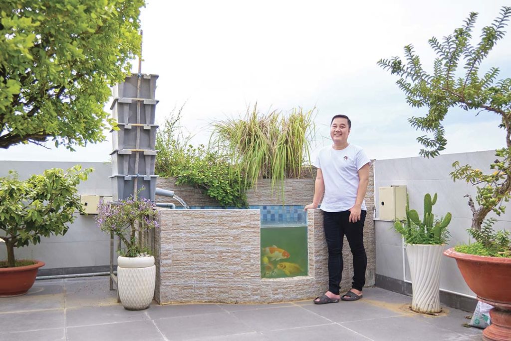 Không như trà thất “đến sau”, từ năm 2014 khi anh mua căn nhà này thì đã chủ ý xây hồ Koi rồi. Hồ này trông như làm bằng xi măng nhưng thực ra là kính bọc xi măng, có chừa trống ô cửa để nhìn ngang, đáy hồ lót gạch mosaic xanh lam. Hồ nhỏ ít cá nên chỉ lắp một giàn mưa để lọc. Tuy nhìn qua có chút lạ mắt nhưng khi nghe anh giải thích lý do đằng sau đó, thiết kế ấy trở nên vô cùng hợp lý. Ô kính bên hông hồ giúp anh tương tác với cá từ xa, thay vì đến gần thì ngồi ở trà thất cũng vẫy chúng được. Đáy hồ màu xanh không hút nhiệt như màu đen ta thường dùng, vì thế anh cũng không cần phủ bạt che nắng. Với thiết kế như vậy, nếu không có sự tư vấn kỹ thuật giúp khắc phục điểm yếu công năng thì hồ chắc chắn không hoạt động tốt được. Anh vui vẻ thừa nhận mình không phải người chơi quá chuyên nghiệp, vì vậy đối với anh, một đơn vị đủ tầm để hỗ trợ đường dài cho người chơi là rất xứng đáng dành thời gian tìm kiếm.