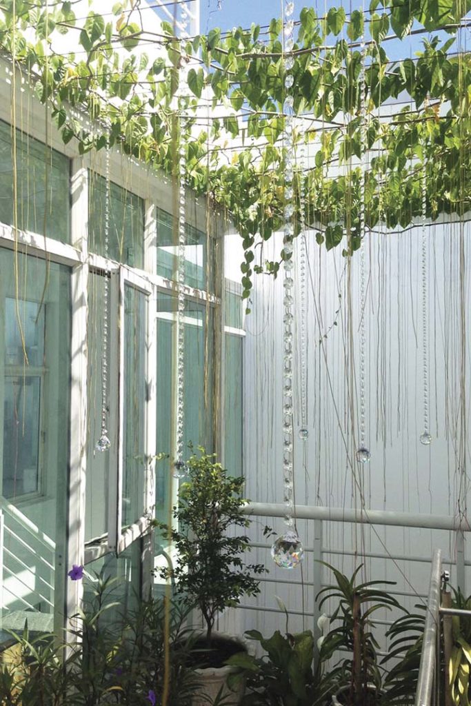 Trước đây, khu vực phòng trà từng được dùng làm giếng trời để nuôi chim, sóc bay và rùa. Sau vì công việc bận rộn không còn thời gian chăm sóc chúng nữa, năm 2019 anh đã thả chúng đi và cải tạo thành nơi thưởng trà. Vì toàn bộ phòng thờ ốp tường kính, hồ Koi cũng có mặt kính nên từ trà thất anh có thể nhìn thấy và tương tác với bầy Koi của mình. Điều đặc biệt nhất ở khu vườn nhà anh đó là việc bố trí được số lượng lớn cây xanh và một hồ Koi trong diện tích chỉ khoảng 25m2 mà vẫn thoáng mát.